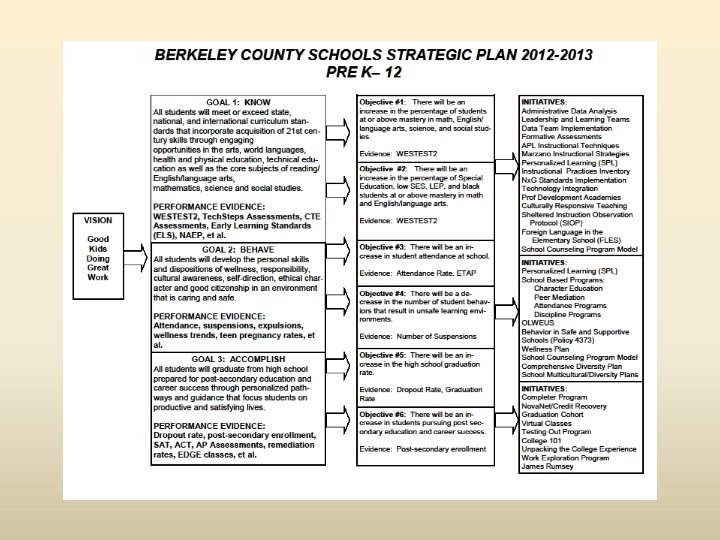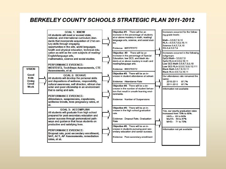 S. M. A. R. T. Goals • • • Strategic Measurable Attainable Results-Oriented Time-Bound Berkeley County Schools will increase the number of students at/above mastery in RLA by 10% as measured by the 2013 WESTEST 2.