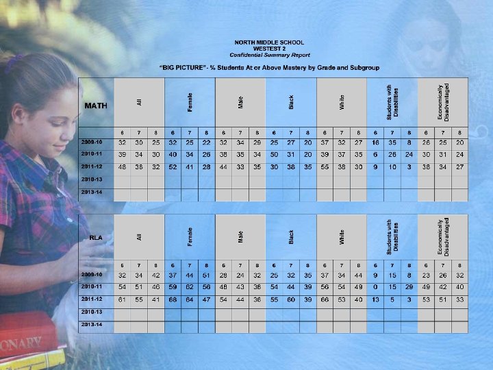 RLA 6 -8 Trend 100 90 80 70 60 50 53 48 54 49 49 48 40 30 20 10 0 6 7 8 Berkeley County Schools. 401 South Queen Street. Martinsburg, WV 25401 2012