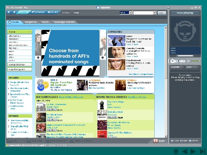 Napster: Able to Do • Download MP 3’s • Play radio (Premium only) • Search by… – – Artist Album Track Member • Burn directly (by Roxio technology) • Charts – Billboard – Napster