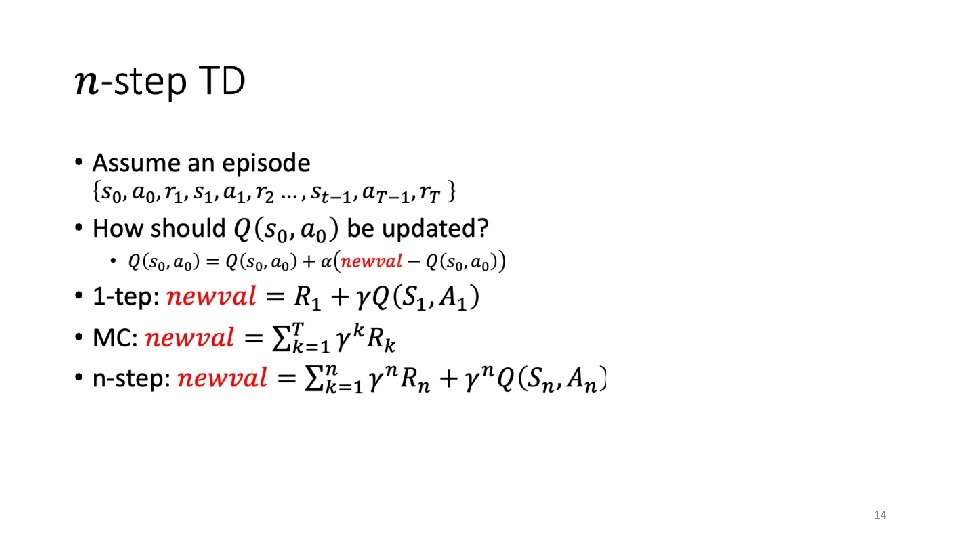 Fuse MC and TD Monte-Carlo � On-policy (but important sampling can be used) � Requires a full episode to train on � Noisy learning (high variance) � Efficient value propagation Temporal-Difference learning � Off policy � Local learning, propagating values from neighbors (Bootsraping) � slow value propagation 13