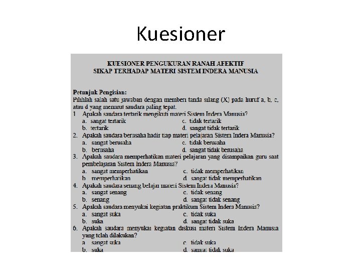 Rating scale • Rating scale mengukur pertibangan tentang hasil dicapai seseorang baik berupa tingkah laku maupun produk. Pengukurannya biasanya menggunakan angka, dimana tiap angka memiliki nilai tingkah laku tertentu; 5=sangat baik, 4=diatas rata-rata, 3=rata-rata, 2=dibawah rata-rata No Pernyataan 1 Mendengarkan instruksi guru 2 Mendengarkan pendapat siswa lainnya 3 Berpartisipasi dalam diskusi kelas Skala 2 3 4 5