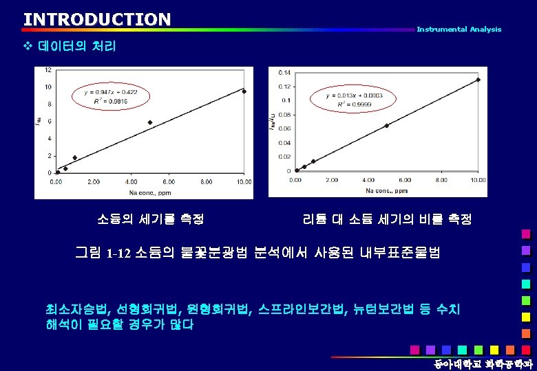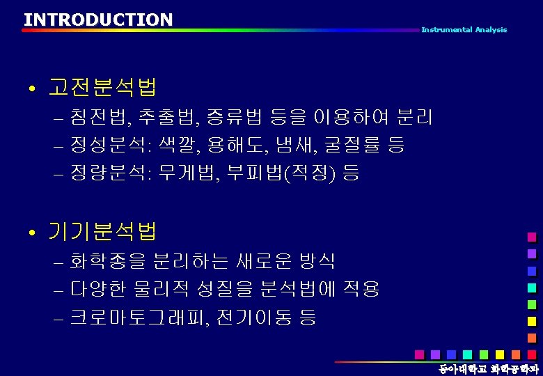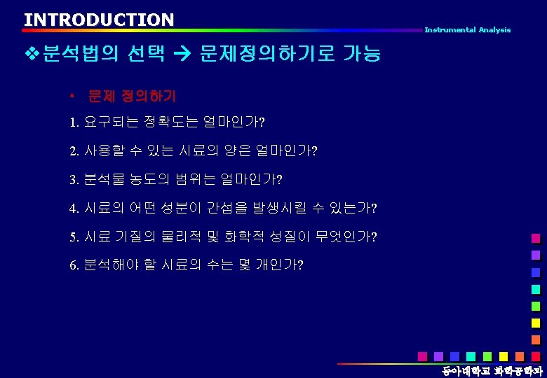 INTRODUCTION Instrumental Analysis v Analytical researcher ? Should have good theoretical knowledge of methods and instruments for q Develop experimental technique and theory q Develop specialized analytical training q Develop the capability to direct the work of other chemical engineers 동아대학교 화학공학과