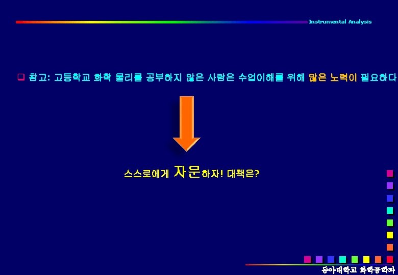 INTRODUCTION Instrumental Analysis v 기기분석의 구성 q Instruments란? Anything used as an aid in doing physical work q aid? Servant of analyst(분석자의도움) q physical? Rely on physical process 예) 화학 반응 중 연기가 난다면 모두 똑 같은 원인인가? 동아대학교 화학공학과