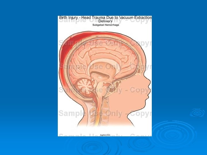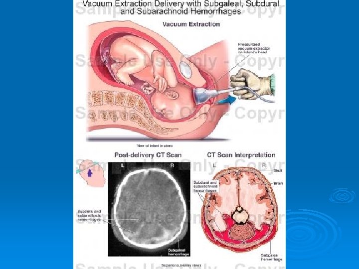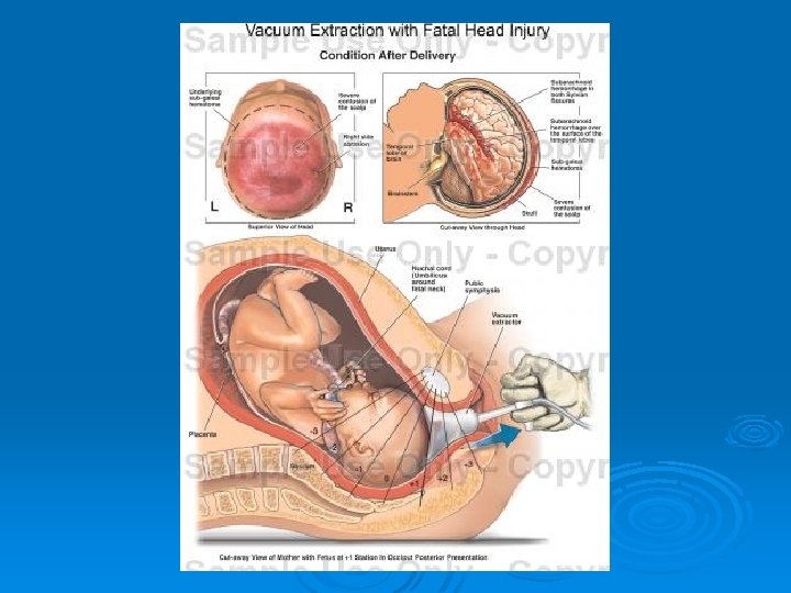 FETAL COMPLICATIONS Ø Localized scalp oedema (artificial caput or chignon) l harmless and disappears in a few hours. Ø Cephalohaematoma requires observation and usually will clear in 3– 4 weeks. Ø Scalp abrasions / lacerations l Ø Clean and examine lacerations to determine if sutures are necessary. Necrosis is extremely rare. Intracranial bleeding l Extremely rare and requires immediate intensive neonatal care.