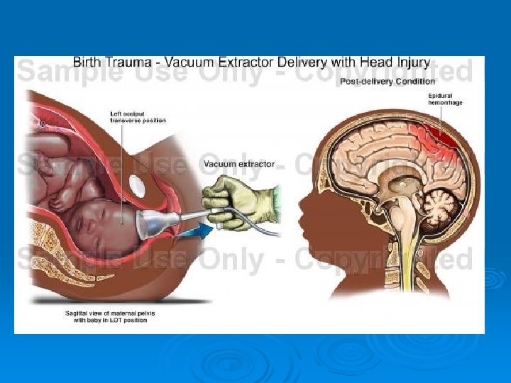 FETAL COMPLICATIONS Ø Injury to facial nerves l Ø Lacerations of the face and scalp l Ø Requires observation. This injury is usually self-limiting. Clean and examine lacerations to determine if sutures are necessary. Fractures of the face and skull l Require observation.