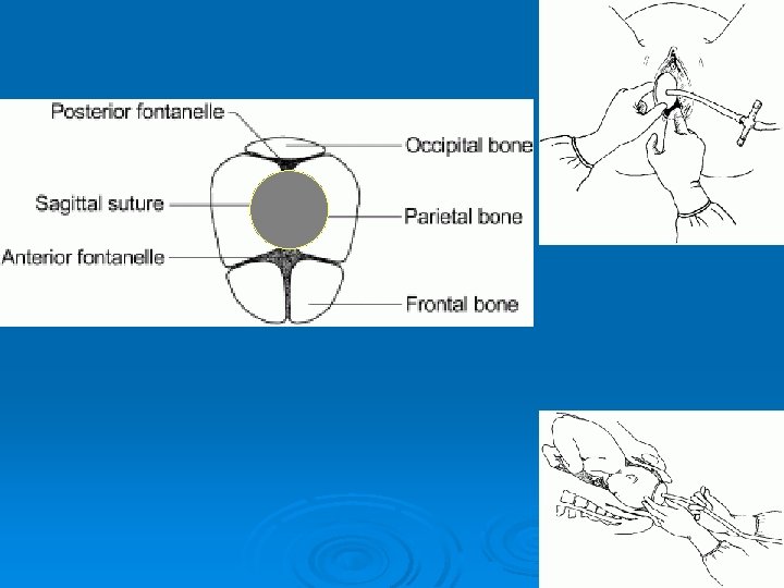 Procedure Ø Check all connections and test the vacuum on a gloved hand Ø Provide emotional support and encouragement. If necessary, use a pudendal block Ø Assess the position of the fetal head by feeling the sagittal suture line and the fontanelles. Ø Identify the posterior fontanelle