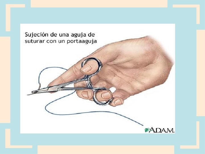 CAJA DE CURAS: Material de sutura ● Une los bordes de una herida o incisión y los mantiene unidos. Pueden ser de 2 tipos: -Suturas manuales (hilos, agujas, portagujas) -Suturas Metálicas (grapado quirúrgico)