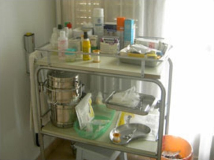 Función del auxiliar • Limpieza diaria • Reposición del material • Bandeja superior: – Sueros, antisépticos, caja de curas, gasas, guantes… • Cajones: – Fármacos, catéteres, conexiones… • Bandeja inferior: – Paquetes compresas, paños campo, mallas, vendas, jeringas…