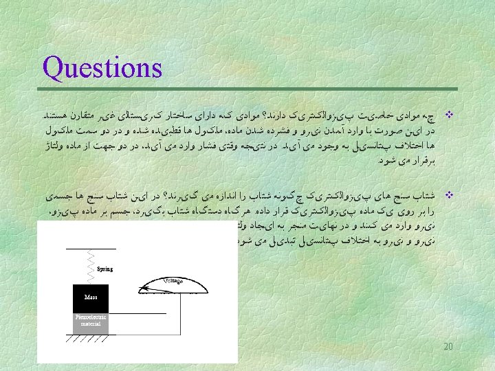 Drawback v Cannot be used for truly static measurements. u In conventional readout electronics, imperfect insulating materials and reduction in internal sensor resistance causes a constant loss of electrons and yields a decreasing signal. 19
