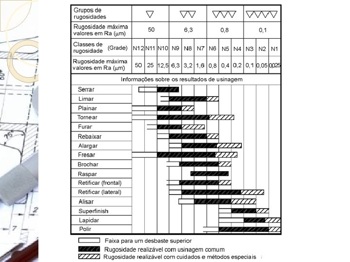 Simbologia, Equivalência e Processos de Usinagem Tabela Classifica os acabamentos superficiais Organiza de acordo com o grau de rugosidade e o processo de usinagem que pode ser usado para sua obtenção Classifica a rugosidade através de simbologia