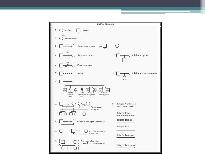GENOGRAMA • O GENOGRAMA FAMILIAR é uma ferramenta usada pelos médicos e por outros profissionais de saúde para resumir em apenas uma página uma grande concentração de informações relacionadas à família.