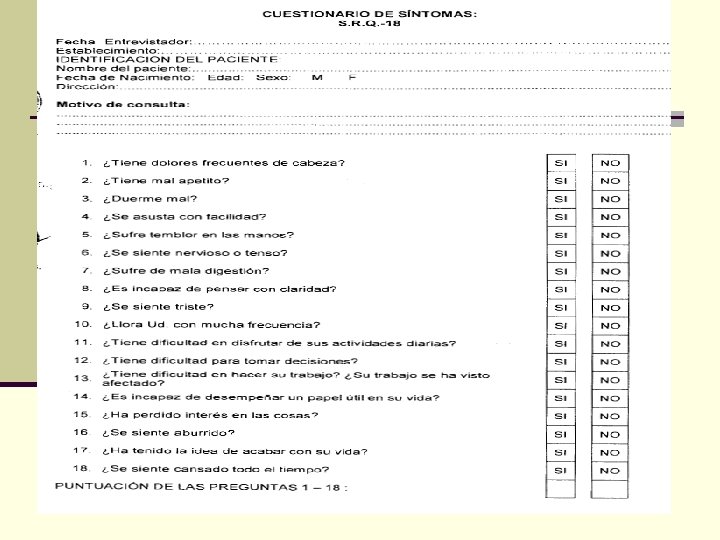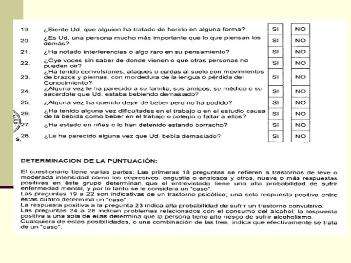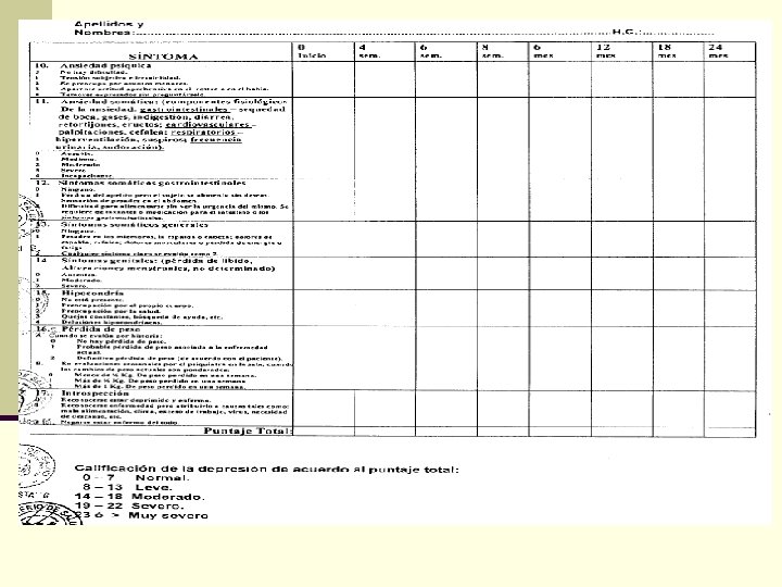 ESCALA DE HAMILTON PARA DEPRESION n Es la escala más frecuentemente usada para evaluar síntomas depresivos. n Si bien fue diseñada para evaluar pacientes con depresión mayor, se ha usado para evaluar síntomas depresivos en otras poblaciones. n La escala original evaluaba 21 síntomas y la validada en el Perú 24, sin embargo el autor recomienda el uso de los 17 primeros síntomas.