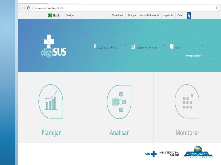 DIGISUS O digi. SUS tem o objetivo de instrumentalizar os gestores públicos, pesquisadores, e toda a sociedade, a obter e sistematizar informações e dados produzidos pelo Ministério da Saúde (MS), por suas entidades vinculadas e por órgãos de pesquisa, e disponibilizá-los, por intermédio da internet, em forma de painéis, mapas, gráficos e tabelas de caráter executivo e gerencial. http: //digisus. saude. gov. br/gestor/#/