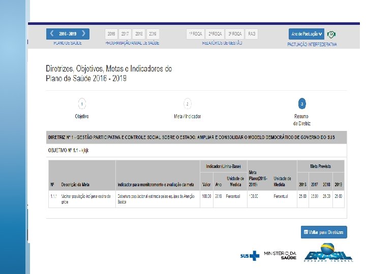 MÓDULO DE PLANEJAMENTO O Módulo de Planejamento possibilitará ao gestor o registro das diretrizes, objetivos, metas e indicadores de seu plano de saúde; a programação anual de saúde e a realização dos seus relatórios de gestão (quadrimestrais e anual), além do registro de metas da pactuação interfederativa. O registro de metas da pactuação interfederativa de 2017 foi realizado no SISPACTO. O registro de metas da pactuação interfederativa de 2018 será realizada no Módulo de Planejamento O relatório de gestão de 2017 e o relatório do 3º Quadrimestre de 2017 ainda serão encaminhados pelo SARGSUS. Todos os relatórios quadrimestrais de 2018 e o relatório de gestão anual de 2018 serão encaminhados pelo Módulo de Planejamento