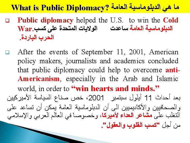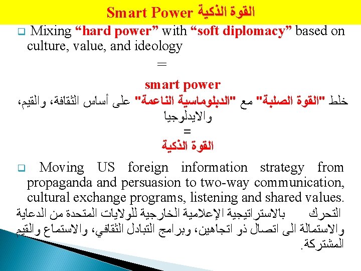 Bush Administration and Public Diplomacy ﺍﺩﺍﺭﺓ ﺑﻮﺵ ﻭﺍﻟﺪﺑﻠﻮﻣﺎﺳﻴﺔ ﺍﻟﻌﺎﻣﺔ q q Voice of America Radio Free Iraq Radio Sawa is a 24 -hours-a-day, 7 -days-a-week service with 48 daily newscasts in Arabic being transmitted by various means. Radio Sawa airs news, analysis, editorial comment, talk and music On February 14, 2004, the United States launched a new $62 million Arabic-language satellite television channel, Al-Hurra, to deliver US messages in Arabic across the Arab world