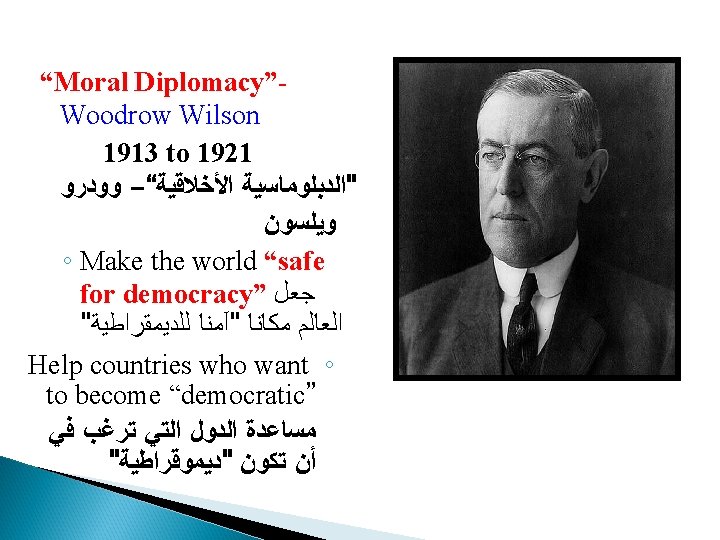 3)- Complete the following sentences: 1. Woodrow Wilson's moral policy was based on…………………. . …………………………………… 2. The US Bush administration used a number of mass media in its public diplomacy campaigns in the Arab world such as ………………………………………… 3. The success of a country’s foreign policy depends on…………. . …………………………………… 4. Hard power can be defined as…………………………………… 5. Coercive diplomacy is based on the idea that……………………………………