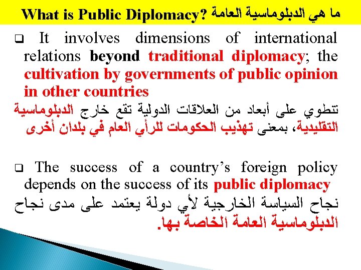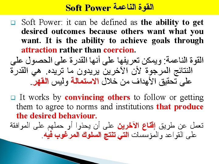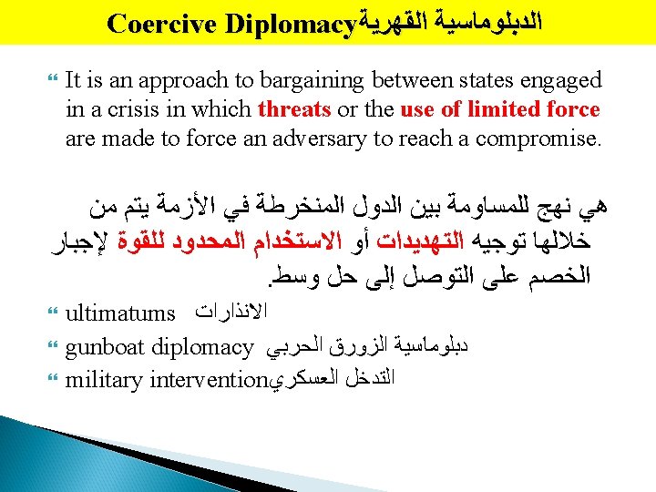 Instruments of International Relations (the DIME framework) ﺍﻟﻌﻼﻗﺎﺕ ﺍﻟﺪﻭﻟﻴﺔ ﺃﺪﻭﺍﺕ ØDiplomatic ØInformational ØMilitary Ø Economic National Policy Objectives ﺃﻬﺪﺍﻑ ﺍﻟﺴﻴﺎﺳﺔ ﺍﻟﻘﻮﻣﻴﺔ