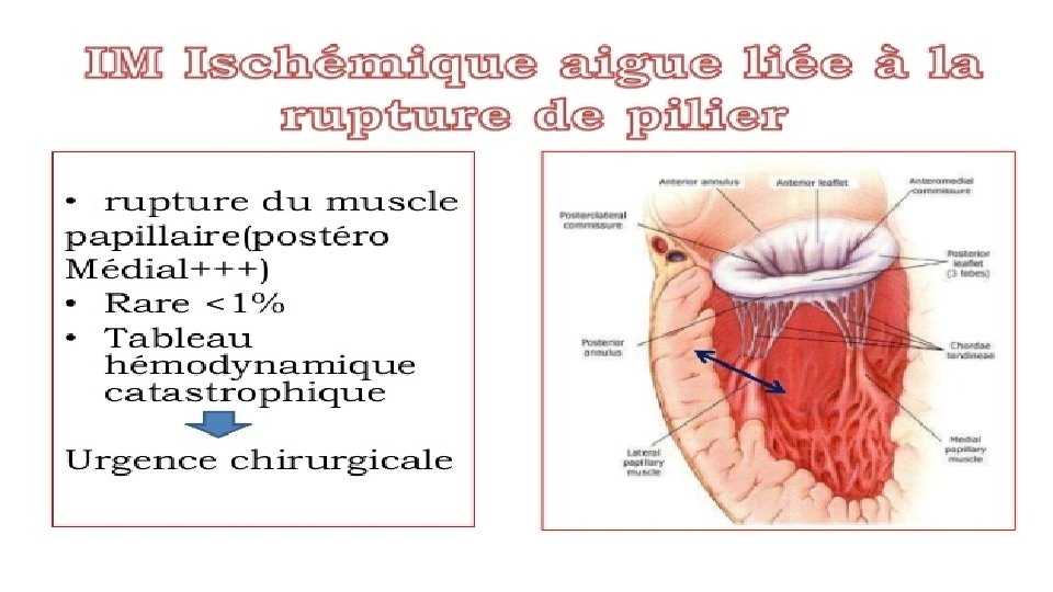IM aiguë = lésion aigue de la valve / cordage/ pilier • Endocardite infectieuse (rupture, mutilation, perforation) • Rupture de cordage dégénérative • Rupture de pilier (post IDM) • Traumatique (iatrogène surtout : post CMP)