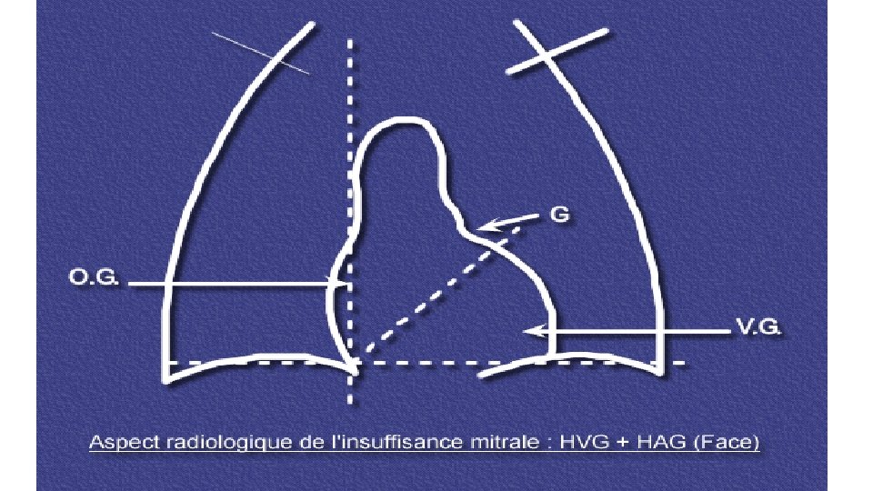 B- IM aiguë D’emblée mal tolérée si importante : sub. OAP ou OAP - souffle IM + B 3 EXAMENS COMPLEMENTAIRES 1) Radio de thorax - normale si IM minime ou modérée - dilatation de l ’OG et du VG + hypervascularisation pulmonaire De face : ü ↑ de l’ index cardiothoracique (ICT> 0. 5) ü arc inférieur gauche allongé (dilatation VG) ü arc moyen gauche convexe et débord arc moyen droit (dilatation OG) ü signes d’hypervascularisation pulmonaire