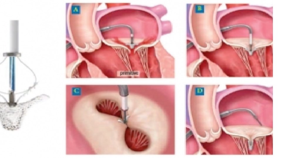 Mitraclip • Traitement non chirurgical de l’IM • La procédure est indiquée pour l’IM significative et symptomatique ayant plusieurs comorbidités avec une espérance de vie de plus de 2 ans • La procédure se fait sous anesthésie générale en salle d’hémodynamie. Le cœur bat normalement pendant la procédure • L’intervention consiste à introduire un cathéter (24 french) via la veine fémorale jusqu’à l’oreillette droite avec cathétérisme transeptal • Le traitement consiste à pincer ensemble, le feuillet postérieur et le feuillet antérieur de la VM, à l’aide d’une micro-pince afin de réduire le reflux du sanguin