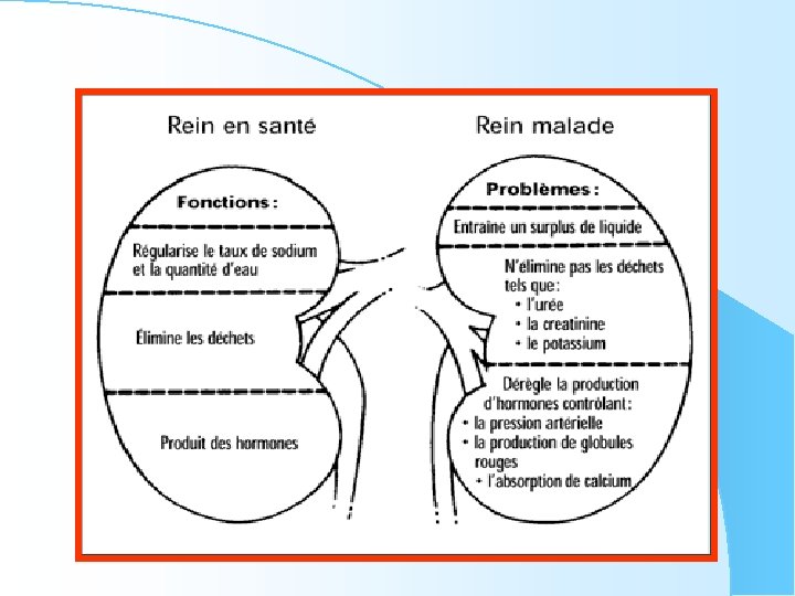 Fonctions physiologiques du rein l Élimination des déchets azotés: – urée, créatinine, acide urique l Régulation du bilan hydroélectrolytique et acidobasique: – sodium, potassium, phosphore, ions H+ l Régulation de la tension artérielle: – système rénine angiotensine aldostérone l Sécrétions endocrines: – vitamine D, érythropoïétine