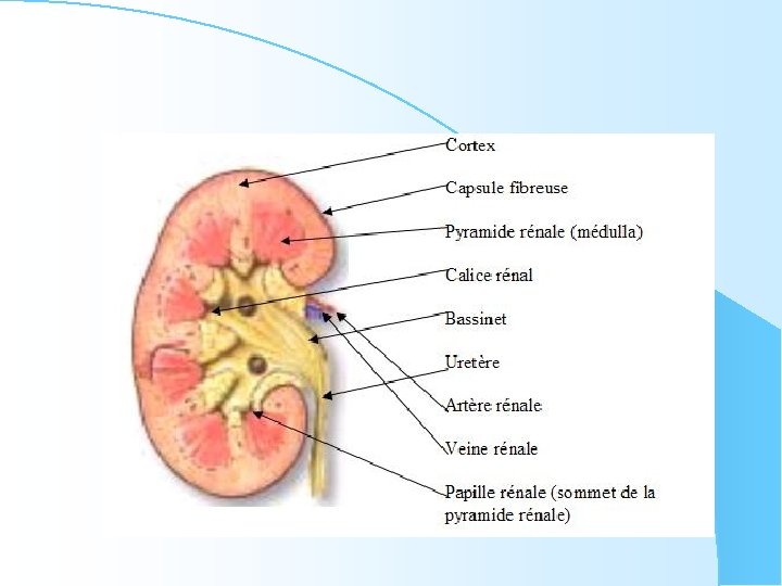 - mesure 12 cm X 6 cm et 3 cm d'épaisseur, pèse 150 grammes. - relié aux gros vaisseaux (l’aorte et la veine cave inférieure) par une artère et une veine, qui forment les pédicules rénaux - Le parenchyme rénal est divisible en deux parties : • Le cortex rénal : sous la capsule rénale et autour de la médulla dans les colonnes rénales (de Bertin). • La médulla composée des pyramides rénales (de Malpighi) - L'urine est transportée par les uretères jusqu'à la vessie où elle est stockée jusqu'à son élimination lors d'une miction.