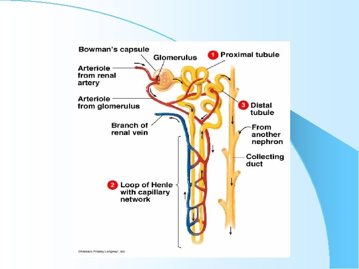 l Le néphron: unité fonctionnelle du rein l Comprend un glomérule et un tubule Le glomérule : un filtre formé par un peloton de vaisseaux minuscules, les capillaires. Le tubule mesure 4 à 8 cm et débouche dans le tube collecteur où s'abouchent d'autres néphrons. l Le tube collecteur débouche dans le bassinet qui débouche sur l'uretère. l Les néphrons sont séparés les uns des autres par le tissu interstitiel.