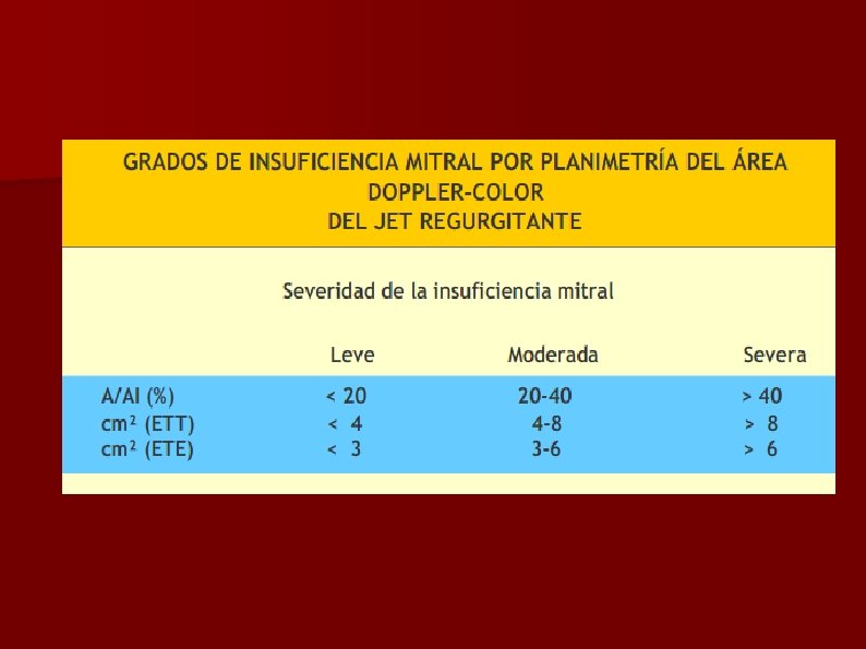 Anchura vena contracta Doppler Leve <0, 3 cm Moderado 0, 3 -0, 69 cm Severo >0, 7 cm