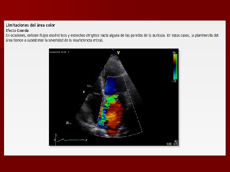 Limitaciones del área color El área no refleja de forma lineal el volumen regurgitante ya que otros factores intervienen en el tamaño del área, como: Tamaño y distensibilidad de la AI y VI Velocidad del flujo regurgitante Gradiente entre VI y AI Frecuencia cardiaca Técnicas: Ganancia del equipo y velocidad Nyquist utilizada