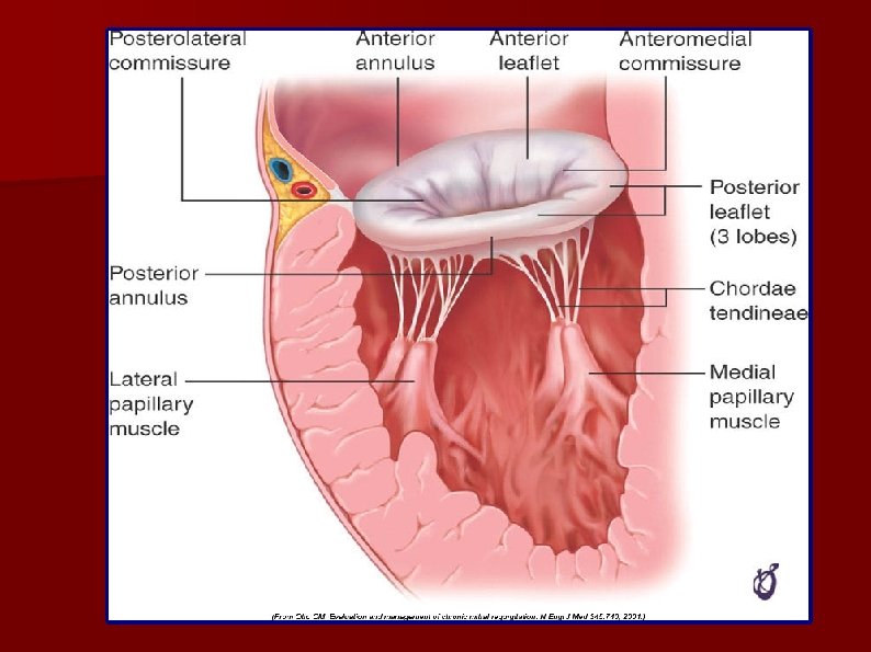 Etiología Trastornos de los velos valvulares Degeneración mixomatosa (PVM) Cardiopatía reumática Endocarditis infecciosa Traumatismo (rotura durante valvulotomía mitral), tumores (mixoma auricular), LES Trastornos del anillo mitral Anomalías de las cuerdas tendinosas Afectación de los músculos papilares