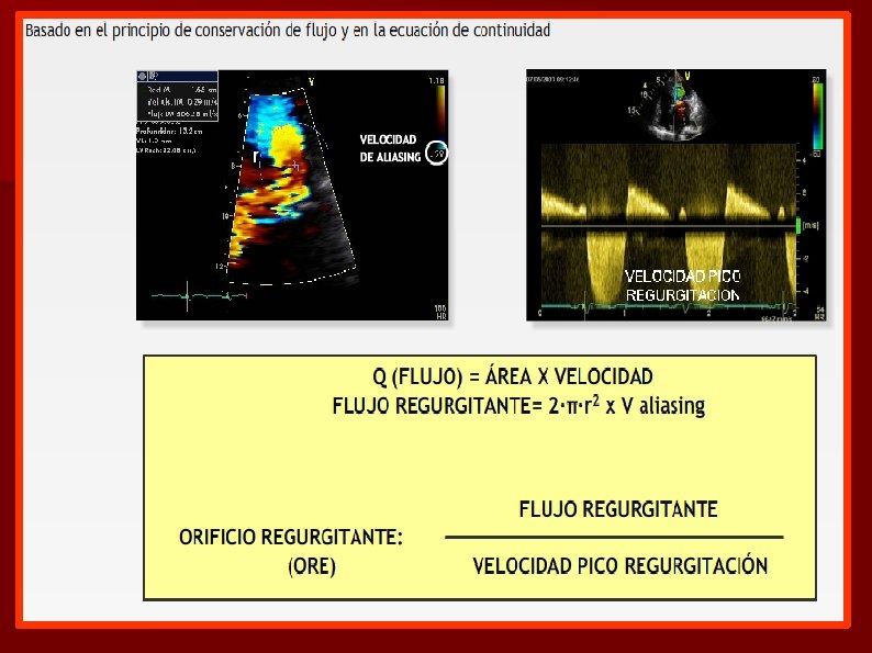 Parámetros Cuantitativos n PISA: área de isovelocidad: – Cuando el flujo se dirige hacia el orificio de regurgitación, la velocidad de la sangre se incrementa. Con doppler color, cuando la velocidad de dicho flujo alcanza el límite de Nyquist, se produce un cambio de color, delimitando una hemiesfera en cuya superficie todos los puntos poseen la misma velocidad (Velocidad Nyquist)