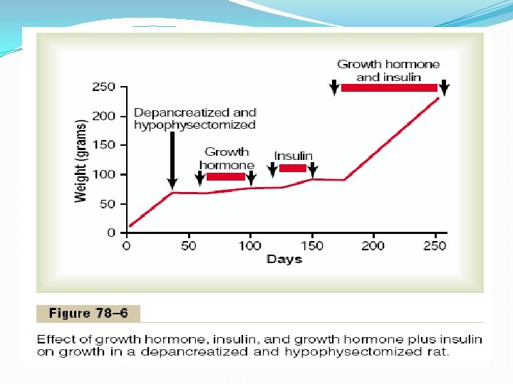 Insulin and Growth Hormone Interact Synergistically to Promote Growth. Because insulin is required for the synthesis of proteins, it is as essential for growth of an animal as growth hormone is. This is demonstrated in Figure 78– 6, which shows that a depancreatized, hypophysectomized rat without therapy hardly grows at all. Furthermore, the administration of either growth hormone or insulin one at a time causes almost no growth. Yet a combination of these hormones causes dramatic growth. Thus, it appears that the two hormones function synergistically to promote growth, each performing a specific function that is separate from that of the other. Perhaps a small part of this necessity for both hormones results from the fact that each promotes cellular uptake of a different selection of amino acids, all of which are required if growth is to be achieved.