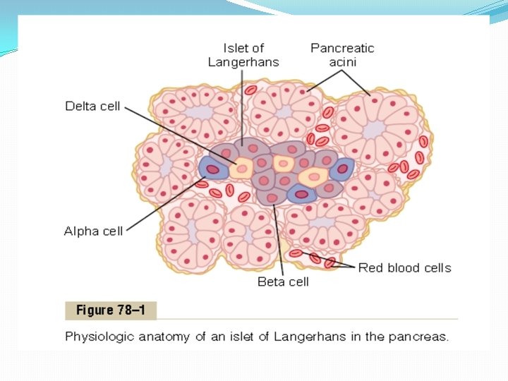 Physiologic Anatomy of the Pancreas. The pancreas is composed of two major types of tissues, as shown in Figure 78– 1: (1) the acini, which secrete digestive juices into the duodenum, and (2) the islets of Langerhans, which secrete insulin and glucagon directly into the blood. The human pancreas has 1 to 2 million islets of Langerhans, each only about 0. 3 millimeter in diameter and organized around small capillaries into which its cells secrete their hormones. The islets contain three major types of cells, alpha, beta, and delta cells, which are distinguished from one another by their morphological and staining characteristics. The beta cells, constituting about 60 per cent of all the cells of the islets, lie mainly in the middle of each islet and secrete insulin and amylin, a hormone that is often secreted in parallel with insulin, although its function is unclear. The alpha cells, about 25 per cent of the total, secrete glucagon. And the delta cells, about 10 per cent of the total, secrete somatostatin. In addition, at least one other type of cell, the PP cell, is present in small numbers in the islets and secretes a hormone of uncertain function called pancreatic polypeptide. The close interrelations among these cell types in the islets of Langerhans allow cell-to-cell communication and direct control of secretion of some of the hormones by the other hormones. For instance, insulin inhibits glucagon secretion, amylin inhibits insulin secretion, and somatostatin inhibits the secretion of both insulin and glucagon.