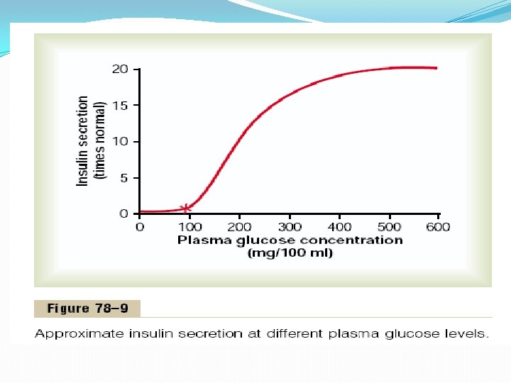 Control of Insulin Secretion Formerly, it was believed that insulin secretion was controlled almost entirely by the blood glucose concentration. However, as more has been learned about the metabolic functions of insulin for protein and fat metabolism, it has become apparent that blood amino acids and other factors also play important roles in controlling insulin secretion (see Table 78– 1). Increased Blood Glucose Stimulates Insulin Secretion. At the normal fasting level of blood glucose of 80 to 90 mg/100 ml, the rate of insulin secretion is minimal— on the order of 25 ng/min/kg of body weight, a level that has only slight physiologic activity. If the blood glucose concentration is suddenly increased to a level two to three times normal and kept at this high level thereafter, insulin secretion increases markedly in two stages, as shown by the changes in plasma insulin concentration seen in Figure 78– 8.