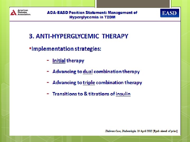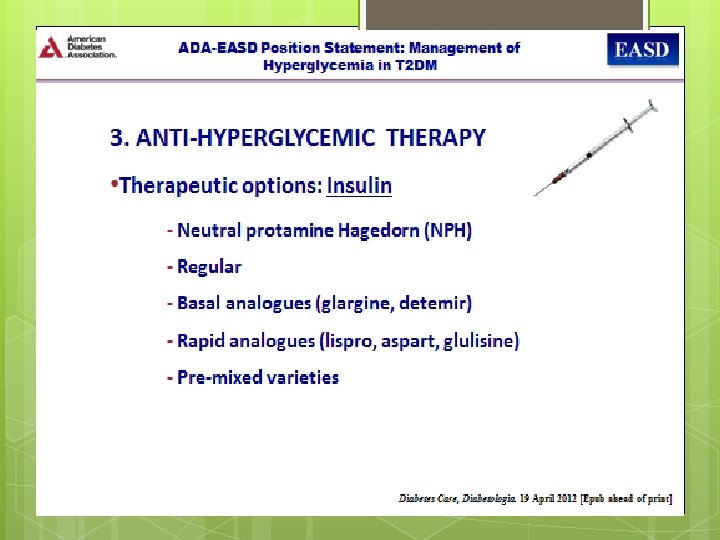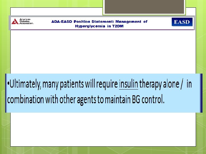 ADA/EASD 2015 Position Statement The ADA/EASD guidelines support the use of patient specific insulin therapy to achieve a glycemic profile as close to normal as possible while minimizing adverse effects such as weight gain and hypoglycemia.