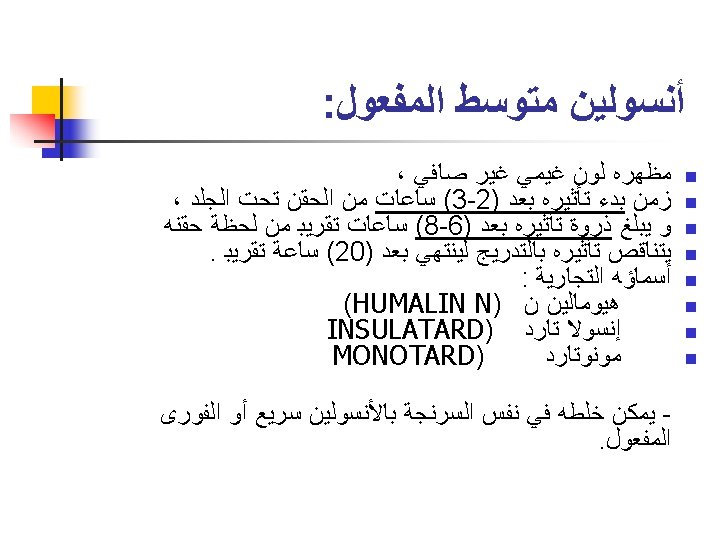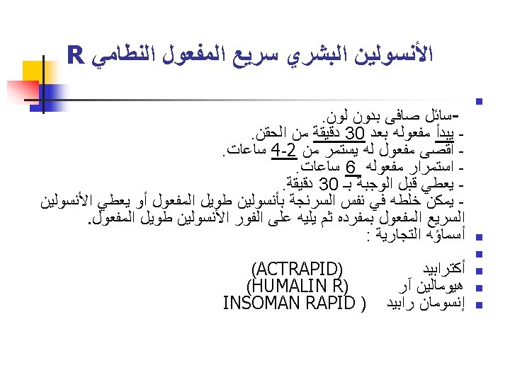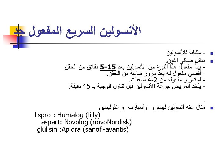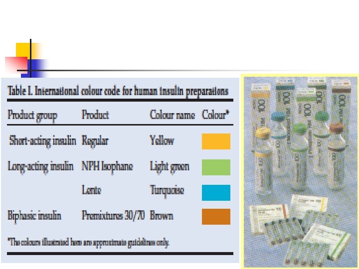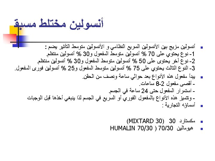 Pre mixed 70/30 (70% N, 30% R) Humulin 70/30 (Eli Lilly) n Mixtard 30 (Novo) (Also available as Mixtard 30 Novolet Pen) n Dongsulin 70/30 (Highnoon) n Insuget 70/30 (Getz) ================== n Analogs n n n Novomix 50 (Novo) Humolog Mix 25(Lilly) Humolog Mix 50(Lilly)
