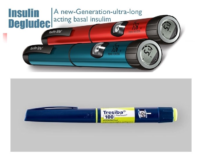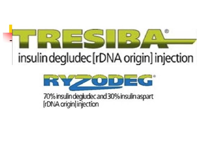 Insulin degludec and insulin degludec/ aspart. new n n Novo Nordisk’s ultra-long-acting basal insulin degludec (“Tresiba”) premixed combination of 70% degludec/30% fast -acting Novolog (Ryzodeg) flatter and stable profile, reduced risk of hypoglycemia flexible dosing