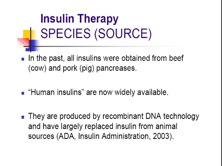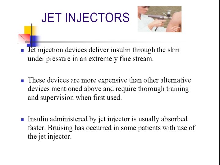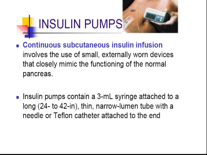 Insulin treatment indications n type 1 diabetes requires lifelong insulin treatment Acute comlications ; DKA patients with type 2 : improve metabolic control -hyperglycemia- As initial therapy if presenting A 1 C≥ 9. 0% in newly diagnosed Stress –trauma-surgery infection … Renal failure – diabetic foot. . women on oral hypoglycemic drugs who wish to conceive-pregnancy n receiving high-dose steroid therapy. n Weight loss n n n