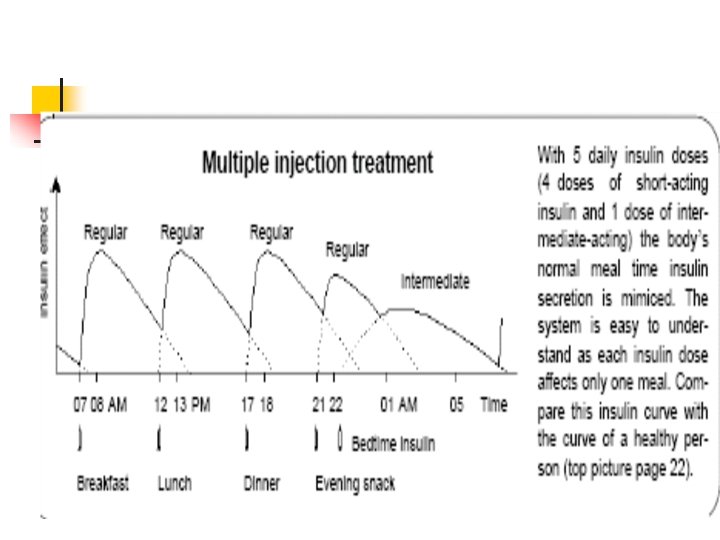 I N S U Two doses: The usual dosing commonly used. Initial insulin therapy L I N Three doses: J Four doses: T I O N Brittle diabetic patient. Pregnant mothers specially type 1. E C Used for active patients. Patients taking two main meals. I N Four doses: Brittle diabetic patient. Pregnant mothers specially type 1. Motivated patients. Multiple Insulin Injection Therapy