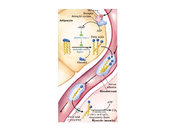 Attivazione del processo di ossidazione degli acidi grassi Questo processo è innescato dagli ormoni adrenalina e glucacone prodotti in condizioni di basse concentazione di glucosio nel sangue ed in condizioni di stress mentre è inibito dall’insulina In queste condizioni: a) I grassi introdotti con la dieta sono utilizzati a scopo energetico b) I triacilgliceroli conservati nel tessuto adiposo sono mobilizzati e trasportati ai tessuti in cui saranno ossidati ( Muscolo scheletrico, cuore, corteccia surrenale)