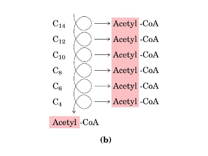 L’equazione finale è Palmitoil Co. A + 7 Co. A +7 FAD + 7 NAD + 7 H 20 8 acetil Co. A +7 FADH 2 + 7 NADH+7 H+ BILANCIO ENERGETICO FADH 2 1, 5 MOLECOLE DI ATP NADH 2, 5 MOLECOLE DI ATP QUINDI 4 MOLECOLE DI ATP PER OGNI UNITA’ BICARBONIOSA STACCATA Totale 28 ATP L’acetil COA può essere ossidato a CO 2 e H 2 O nel ciclo di Krebs Palmitoil Co. A +23 O 2 + 108 Pi + 108 ADP Co. A +108 ATP 16 CO 2 + 23 H 2 O