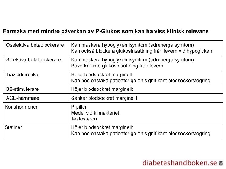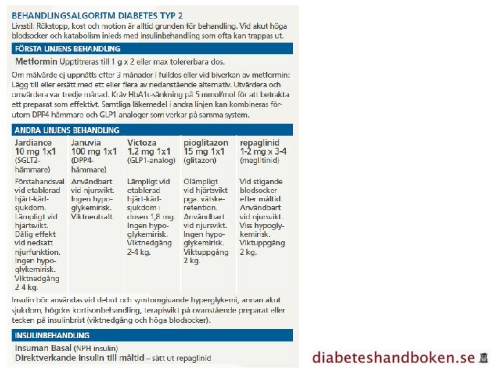 Nattliga hypoglykemier Carl Johan Östberg et al 2009 • 98 patienter i särskilt boende med insulin och Hb. A 1 c < 6% • Blodsockerkurvor under 3 dygn • 69% någon hypoglykemier • 50% av dessa nattetid • Peroral behandling sattes ut och insulindoserna halverades • Fungerade för 75 % efter 3 månader