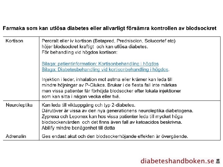 Hormoner och transmittorsubstanser som påverkar blodsockret. Läkemedel? 1. Glukagon och Somatostatin (pankreas) 2. Tillväxthormon GH (hypofysen) 3. Tyroxin (tyreoidea) 4. Kortison/Adrenalin (binjuren) 5. Adinopektin/Leptin/Resistin (fettväv) 6. Inkretiner GLP-1 mfl (tarmen) 7. Melatonin (tallkottkörteln) försämrar insulinfrisättning. 8. Könshormoner (ovarier, placenta, testiklar) 9. Noradrenalin/Dopamin/Melatonin m fl (Sympatiska nervsystemet)