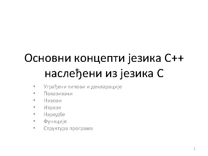 Уграђени типови и декларације int i; int j=0, k=3; float f 1=2. 0, f 2=0. 0; double Pi=3. 1415926; char a='a', nul='0'; 9