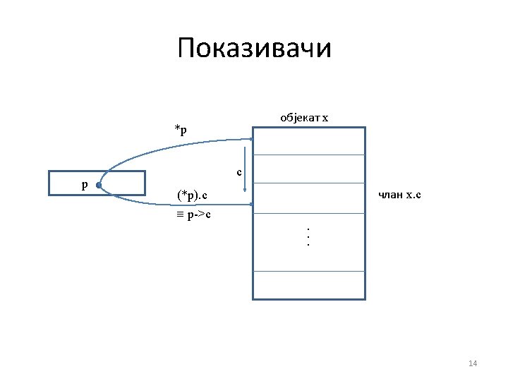 Показивачи osoba otac("Petar Simic", 40); // objekat otac klase osoba; osoba *po; // po je pokazivac na tip osoba; po=&otac; // po ukazuje na objekat otac; (*po). ko_si(); // poziv funkcije ko. Si objekta otac; po->ko_si(); // isto što i (*po). ko. Si(); 13