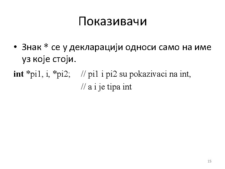 Показивачи int i=0; int *pi 1=&i, *pi 2; void *pv; pv=pi 1; pi 2=pv; // pi 1 i pi 2 su pokazivaci na int // pv je pokazivac na void // sada i pv ukazuje na i // greska! 20