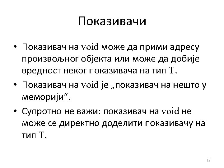 Показивачи int i=0, j=0; int *pi=&i; int **ppi; ppi=π *pi=1; **ppi=2; *ppi=&j; ppi=&i; // i i j tipa int; // pi je pokazivac na int, ukazuje na i; // ppi je tipa "pokazivac na - int"; // ppi ukazuje na pi; // pi ukazuje na i, pa i postaje 1; // ppi ukazuje na pi, // pa je rezultat operacije *ppi objekat pi; // rezultat još jedne operacije * je objekat na koji ukazuje // pi, a to je i; i postaje 2; // ppi ukazuje na pi, pa pi sada ukazuje na j, // a ppi još uvek na pi; // greška: ppi je pokazivac na int, // a ne pokazivac na int! 17