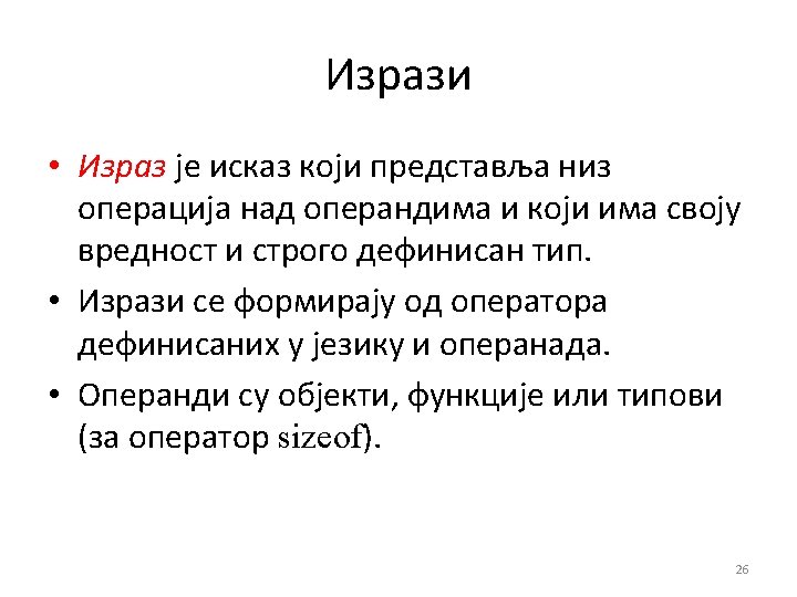 Низови int a[10]; int *p=&a; a[2]=1; p[3]=3; p=p+1; *(p+2)=1; p[-1]=0; // a je niz objekata tipa int; // p ukazuje na a[0]; // a[2] je isto što i *(a+2); a se konvertuje u // pokazivac koji ukazuje na a[0]; rezultat // sabiranja je pokazivac koji ukazuje na a[2]; // dereferenciranje tog pokazivaca (*) // predstavlja zapravo a[2]; a[2] postaje 1; // p[3] je isto što i *(p+3), a to je a[3]; // p sada ukazuje na a[1]; // a[3] postaje sada 1; // p[-1] je isto što i *(p-1), a to je a[0]; 25