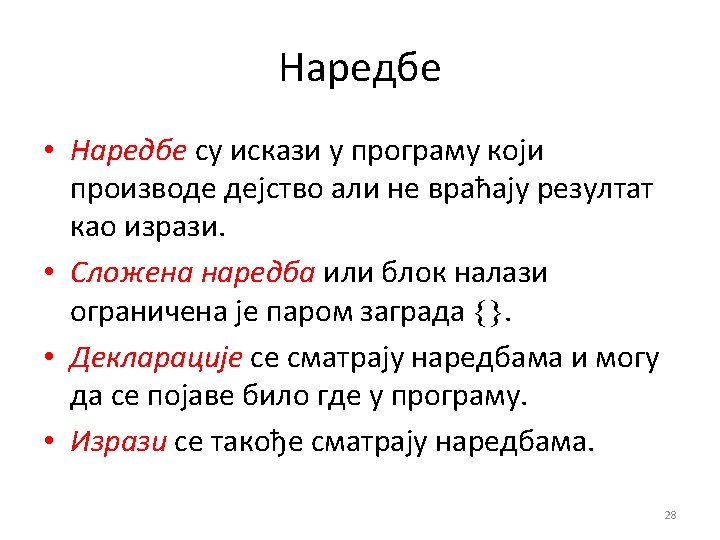 Изрази • Оператор доделе: a=b; // a je levi a b desni operand operacije dodele // oznacene sa = a=b=c; // dodeli c objektu b i vrati tu vrednost; zatim // dodeli tu vrednost u a; prema tome, c je // dodeljen i objektu b i objektu a; • Видимо да оператор доделе има споредни ефекат. 27