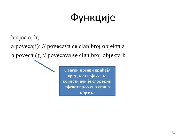 Функције brojac b; // poziv konstruktora int a=0, c=1; a=c+b. povecaj(); int brojac: : povecaj() { return ++broj; } 40